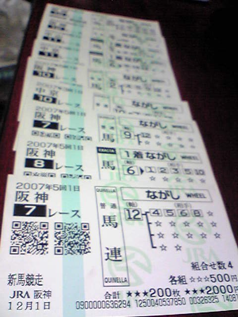 れこが・・・「始祖さん忙しいんじゃなかったの?」 !!!!_| ̄|○ 始祖ジュラに9999のダメージ! 何してんでしょうね?大概バカヤローだな俺はw まぁ結果待ちで暇なんですが^^; で、日は、代わり、本日、朝から暇こいてリネしてた訳だが ウサ晴らしにナイトをやり始めたとこで ししゃもからメールが来た・・・ しゃ「暇か?」 始祖「暇や」・・・(ぉぃ しゃ「大阪にモーターショー見に行くのと阪神に競馬行くんどっちがええ?」 ・・・・始祖「じゃあ競馬で!」・・・(ぉぃ ・ ・ ・ ・ まぁ・・・言わずもがな! 当てたのは、俺1つ、ししゃも0・・・乙! 兵どもが夢の後・・・・ ライアンを信じて居れば4レースは、取って余裕の黒字だったのに・・・ ライアンと子のブライト、この2産駆でしばかれた_| ̄|○ 後は、頭当ててヒモで外すとか・・・単で頭当てて外すなよ・・・と 2万くらい負けたかな・・・まぁ精神的なショックのが問題だ 帰り際は、二人で 「次は、戦績は、見ずにライアンは、買おうな」・・・と確認し合う。 いい加減懲りろよと・・・_| ̄|○
