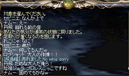 INしたらウサウサゆってます_| ̄|○ アフォだ俺は、・・・ ウサギ帽子は、未変身状態で落ちると INしなおした時は、勝手にウサウサ言わされます って、事で またしても重ねがけを手伝って貰う事にw さぁとりあえず最初は、ウサギ帽子は、外して エントの居るエルフの森へGO! 居ました居ました本日の主役、魔法使いエント君です! 強制変身アイテムであるウサギ帽子も エントのシェイプチェンジにかかれば関係なく もれなくオークにしてもらえますw 先にイミュかけてからニヒが叩き始めるのを確認して ウサギ帽子を装着して静かに待ちます (゚Д゚)<いつでもバッチコーイ! その間、ウサギ帽子を着けている為 魔法が使え無いんでニヒには、POTでひたすら耐えてもらいます さぁ来い!!! Σ(゚Д゚;≡;゚д゚) エント死んでるよ!w お仲間って事で一緒に襲って来たのも 仲良くあの世に行って貰いました。(-ノ-)/Ωチーン そうこうしてるうちにまた新たなエント発見! さっきと同じ要領で行きます。 (´∀`)ちょっとお話を伺ってみましょうか (;´∀`)お怒りのようですね・・・ 気にせず行きましょうw エントがRES使った時と同じオレンジ色の光を発すると! (´∀`)ノはい、成功です これによりウサギ帽子を装着してる状態なのに 本来外される武器も装着できるようになります もちろん狩りに行く前に通常の変身に切り替えます。 一つだけ問題があって、その後ヘルムの着け外しは、厳禁です。 俺みたいなアフォが一匹誕生するだけです・・・ ニヒが実験した所、キャンセで未変身状態に戻っても そのままログアウトせずに居るなら使えます。 リスタだけは、ダメですw リスタやログアウトは、落ちる前に変身してからにしましょう セビさんからメリットあるん?と聞かれたんで記述しとくと ウサギ帽子の特殊効果 HP、MP自然回復+2が付きます アビスリング2個分とか、慈愛セット着けたと思えばいいです その後狩りで検証した感じでは、MPの持ちが良くなってたんで これからもこのまま継続して使おうと・・・ HOMR → ウサギ帽子 パワーグローブ → 風グローブ これによってMPR+3!やった~^^b そしてAC2ダウン、MR8ダウン!やった~_| ̄|○ どんどんクラハン専用機になっていくのを感じます '`,、(´∀`)'`,、 クラン員の暖かい火力の支援を要請しますwヨロ^^b